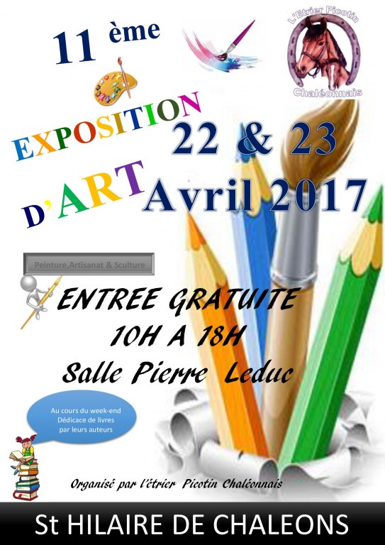L'exposition d'art de l'étrier picotin pointe le bout de son nez 11ème éditions , le 22 et 23 avril de 10 h à 18 h entrée gratuite une quarantaine d'artistes seront présent débutants professionnels peintures diverse technique , sculptures, photos, artisanat diverse mosaïque, ,Kirigamie, travail du verre déco de table événementielle, napperon perle... des auteurs seront présents pour dédicacée leur livres. des jeune chaléonnais seront là aussi pour nous présenter leur travail. visiteurs noter cette date sur votre agenda. bar crêpes et restauration sur place. Pour les artistes qui ne serait pas encore inscrit il reste de la place. venez nombreux