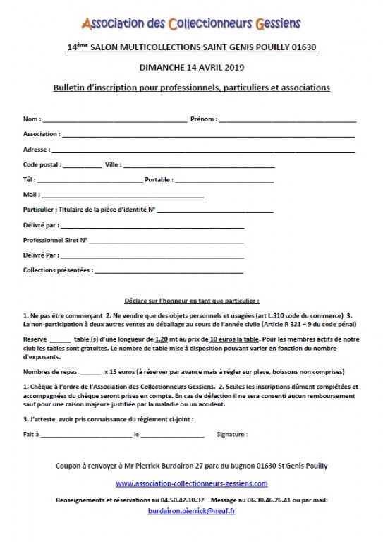 Tarification : 10€ la table de 1m20 pour les professionnels et particuliers