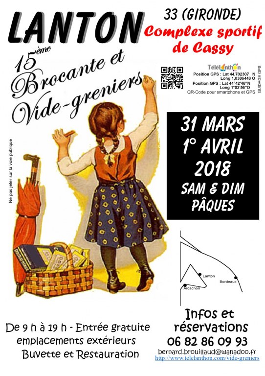 Au profit du Téléthon 2018, 15° Foire à la Brocante et Vide-Greniers les 30 mars et 1° avril 2018 au Complexe sportif de Cassy à Lanton 33138.