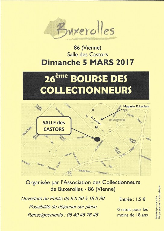 26 ème bourse des collectionneurs de Buxerolles. horaires : 9h00 - 18h00. Possibilité de restauration sur place (repas froid ou sandwitcherie). Cette année encore, venez nous retrouver pour rencontrer des passionnés dans les domaines des cartes postales, monnaies, livres, BD, jouets, figurines, disques, poupées, timbres, capsules de champagne, pierres de collection, vieux objets, vieux papiers, etc. .