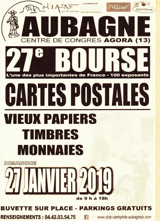 BOURSE AUX CARTES POSTALES, VIEUX PAPIERS, MONNAIES, TIMBRES OUVERTE AUX PROFESSIONNELS ET AMATEURS. ORGANISEE PAR LE CLUB CARTOPHILE AUBAGNAIS