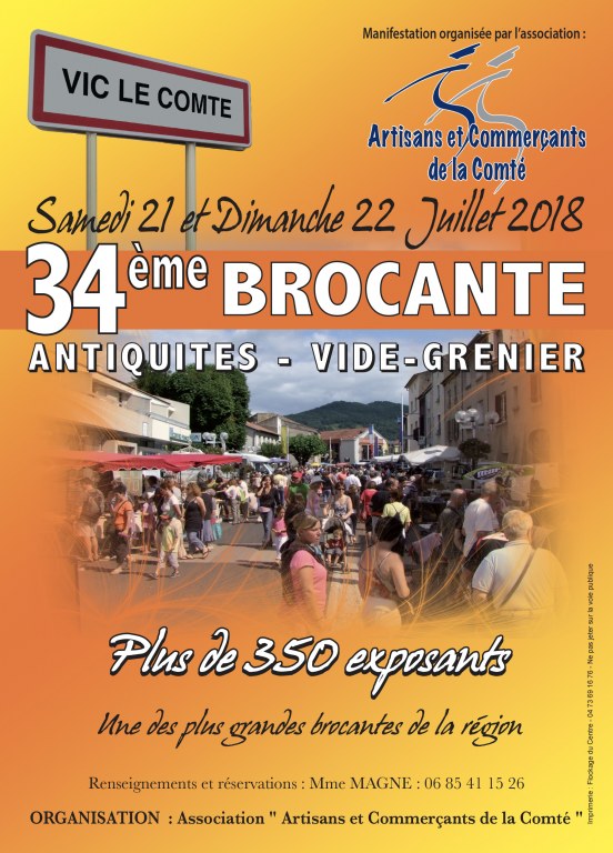 Les samedi 21 et dimanche 22 juillet 2018 à VIC LE COMTE se déroulera la 34ème édition BROCANTE – ANTIQUITES – VIDE GRENIER organisée par les Artisans et Commerçants de la Comté dans les rues de VIC LE COMTE.