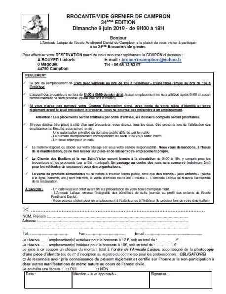 Infos et réservations au 06 68 13 83 97, par mail brocantecampbon@yahoo.fr