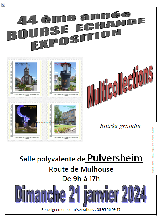 44ème Bourse Multi collections avec exposition de timbres à Pulversheim (68) route de Mulhouse de 9h à 17h. Petite restauration sur place. Entrée gratuite.