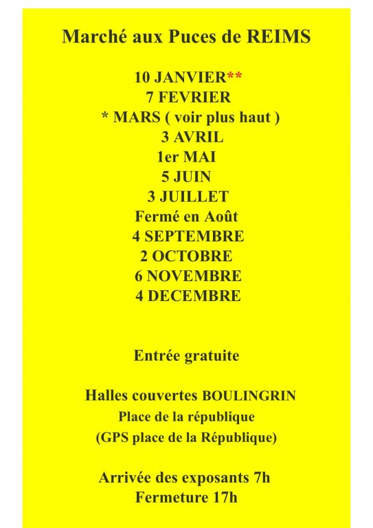 Les Puces de Reims - Halle du Boulingrin- 9h-17h - Intérieur - Entrée gratuite 80 exp. (Professionnels) Tel : 03-26-02-04-06 Fax : 03-26-07-73-40 TOUS LES 1er. DIMANCHES SAUF EN AOUT ORG: " ARTCOM " |
