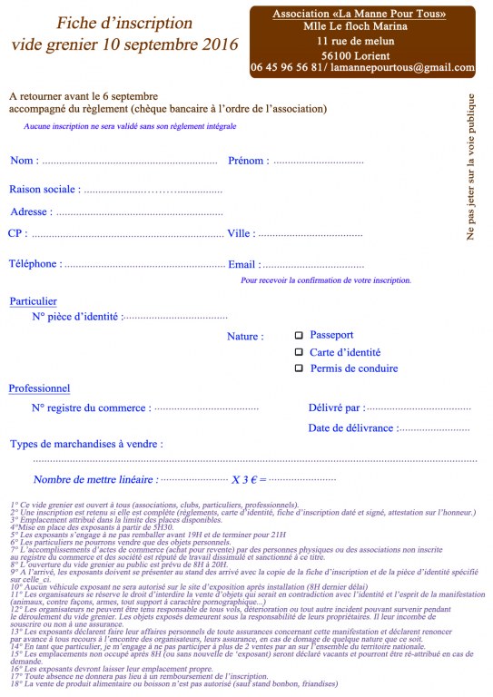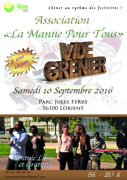 2ème édition du Vide-greniers - Parc Jules Ferry - 8h à 20h - Extérieur - Entrée gratuite 150 exp. (Professionnels + Particuliers + Habitants +) nbsp;Association) Animations (Gospel, jeux... ) Restauration sur place Tel : 06-45-96-56-81 ORG: ASSOCIATION "LA MANNE POUR TOUS" Partenaire : Ouest France |