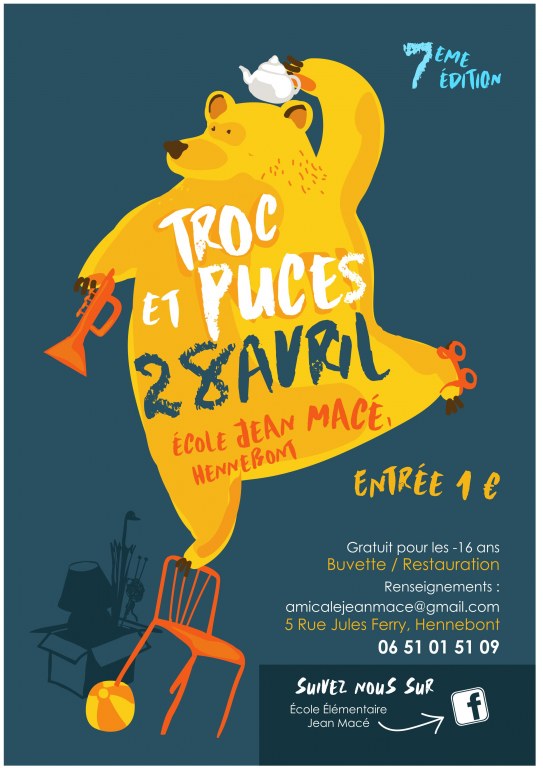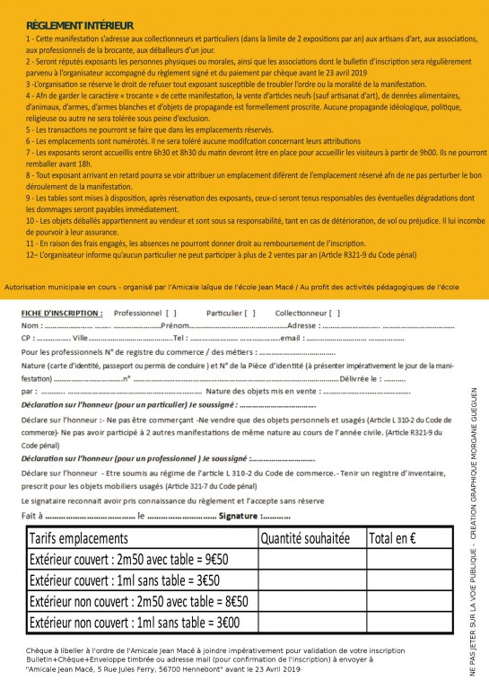 Troc et Puces dans les préaux et la cour de l'école Jean Macé 100 exposants Extérieur couvert Entrée 1€ (gratuit pour les moins de 16 ans) Buvette et restauration (galettes, frites, saucisses), parking à proximité Tarifs emplacements Extérieur couvert (préaux et chapiteaux) : 2m50 avec table = 9.50€ Extérieur couvert (préaux et chapiteaux) : 1ml sans table = 3.50€ Extérieur non couvert (cour) : 2m50 avec table = 8.50€ Extérieur non couvert (cour) : 1ml sans table = 3 €