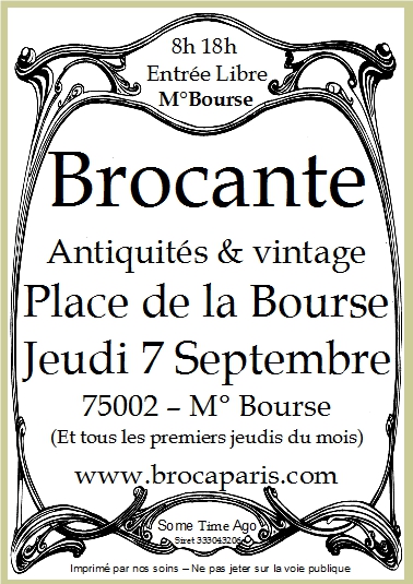 La Brocante a lieu tous les premiers jeudis du mois de 7h30 à 18h00. Accès : Métro BOURSE, BUS, VELIB,AUTOLIB, Parking souterrain sur place.