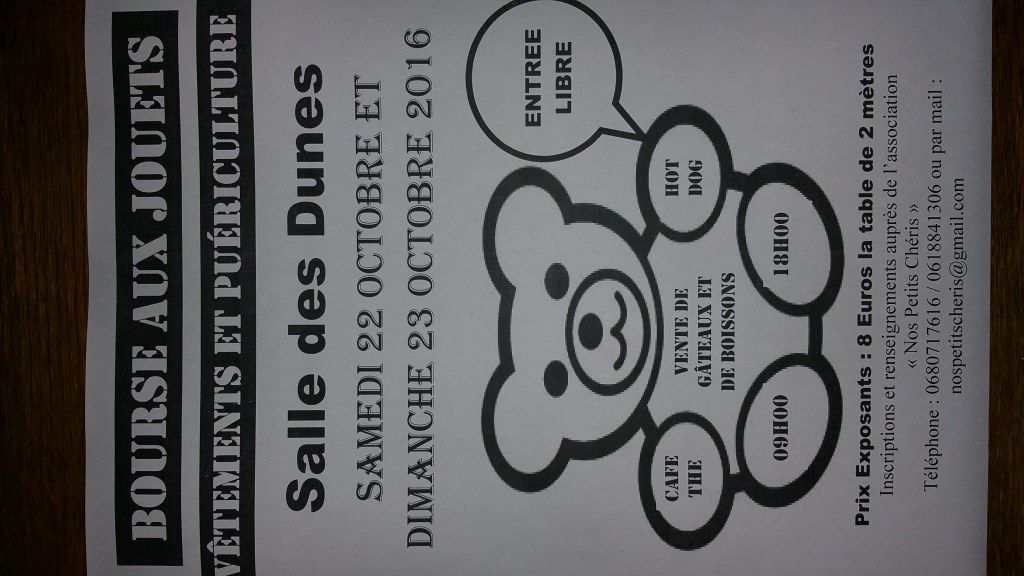 L'association "Nos Petits Chéris" organise la bourse aux jouets le samedi 22 Octobre et le dimache 23 Octobre 2016 à la salle des Dunes , Avenue Jules Ferry à Saint Brevin les Pins.