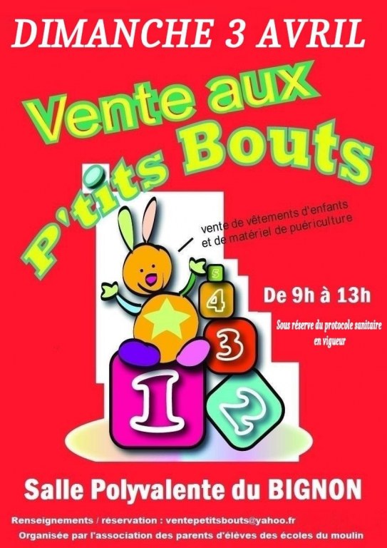 L'association des parents d'élèves des écoles du moulin, organise une "Vente aux p'tits Bouts" (vêtements enfants et matériel de puériculture), le dimanche 3 avril, de 9h à 13h, à la salle polyvalente du Bignon.