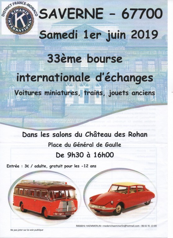Le Kiwanis Club Saverne vous invite à sa 33° Bourse Internationale d'Echange Voitures miniatures ,Trains Jouets anciens le samedi 01 juin de 09h30 à 16h00 dans les salons du château des Rohan à Saverne .