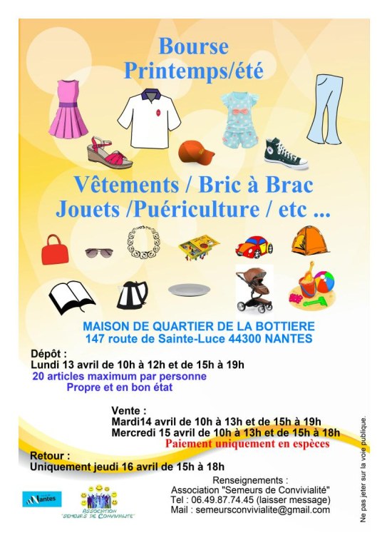 L'association Semeurs de Convivialité organise sa bourse printemps/été (vêtements femme, homme, enfant, puériculture, jouets, vaisselle, petit électroménager, linge de maison, sacs, chaussures, bijoux, foulards,chapeaux, livres, bibelots, petit matériel de camping, jeux de plage, etc... ) du lundi 13 au jeudi 16 avril prochain, à la Maison de quartier de la Bottière.