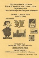 Samedi 17 octobre 2020 93 - Seine-Saint-Denis - Les Pavillons-sous-Bois 21ème Bourse Multicollections Timbres, Cartes postales, Monnaies, ect... . Renseignement Tél. : 01 48 48 37 44 et 06 87 72 51 46 Organisée par le Cercle Philatélique et Cartophile...