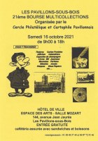 samedi 16 octobre 2021 21ème Bourse Multicollections Timbres, Cartes postales, Monnaies, ect... .. Renseignement Tél: 01 48 48 37 44 et 06 87 72 51 46 Organisée par le Cercle Philatélique et Cartophile Pavillonnais Pass sanitaire obligatoire Localisation : 114 allée Colonel Fabien...