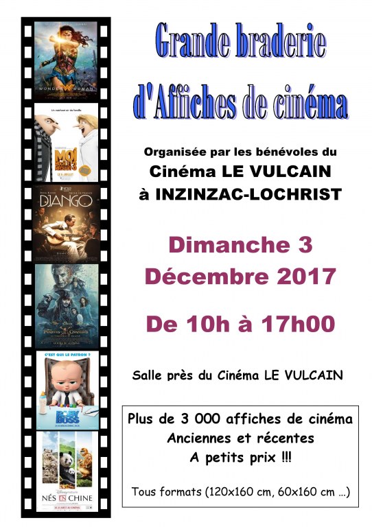 Les bénévoles du cinéma le vulcain, à Inzinzac-Lochrist, organisent leur braderie d'affiches annuelle. Plus de 3000 affiches anciennes et récentes, photos anciennes ... à petits prix (entre 2 et 7 €). Ouvert de 10h à 17h, dans la salle près du cinéma.