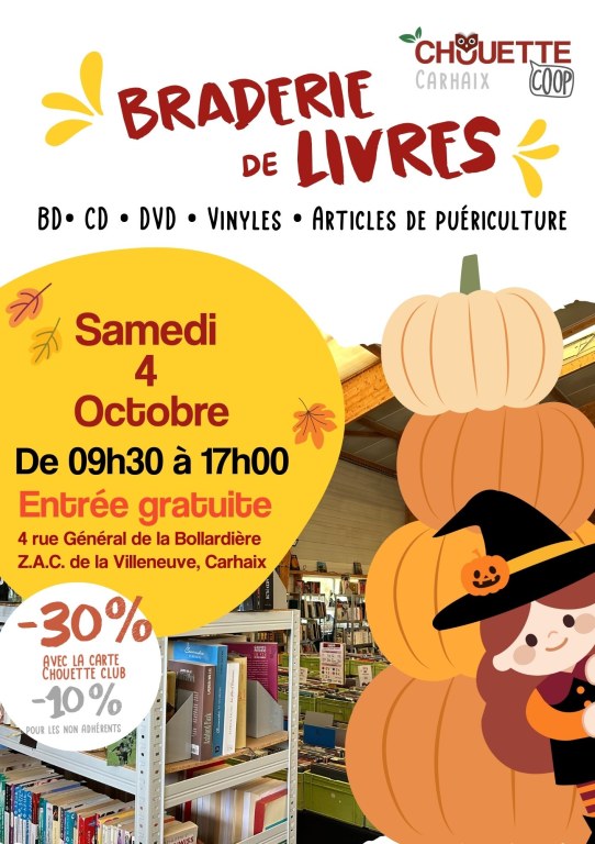 ChouetteCoop organise une grande braderie de livres et de produits culturels d'occasion samedi 4 octobre, de 9h30 à 17h00. Des milliers de livres à petits prix, mais aussi des BD, mangas, DVD, CD, vinyles, jeux seront disponibles, ainsi qu'un rayon avec du matériel de puériculture reconditionnée.