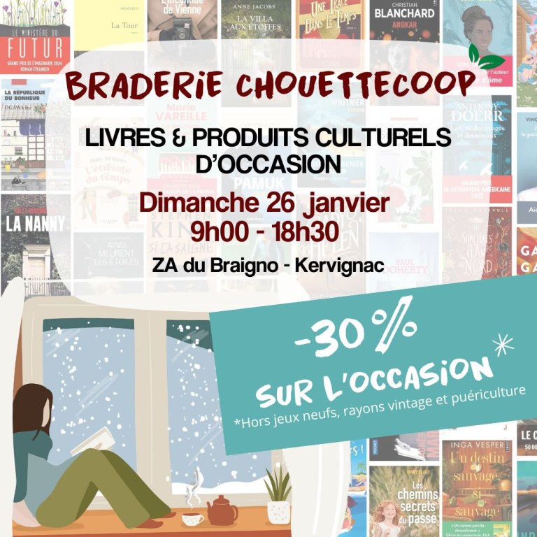 ChouetteCoop organise une grande braderie de livres et de produits culturels d'occasion dimanche 26 janvier, de 9h00 à 18h30. Des milliers de livres à petits prix, mais aussi des BD et des mangas vous attendent, ainsi que de nombreux produits culturels d'occasion (DVD, CD, vinyles, jeux... ).