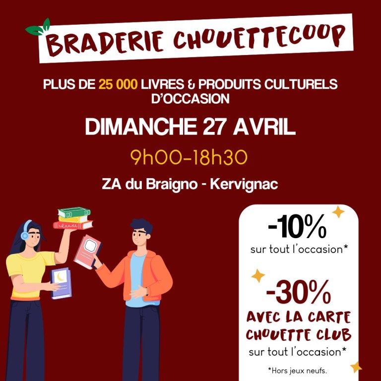 ChouetteCoop organise une grande braderie de livres et de produits culturels d'occasion dimanche 27 avril, de 9h00 à 18h30. Des milliers de livres à petits prix, mais aussi des BD, mangas, DVD, CD, vinyles, jeux seront disponibles, ainsi qu'un rayon avec du matériel de puériculture reconditionnée.