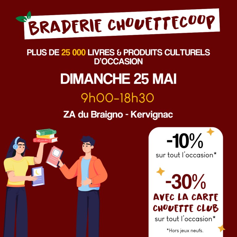 ChouetteCoop organise une grande braderie de livres et de produits culturels d'occasion dimanche 25 mai, de 9h00 à 18h30. Des milliers de livres à petits prix, mais aussi des BD, mangas, DVD, CD, vinyles, jeux seront disponibles, ainsi qu'un rayon avec du matériel de puériculture reconditionnée.