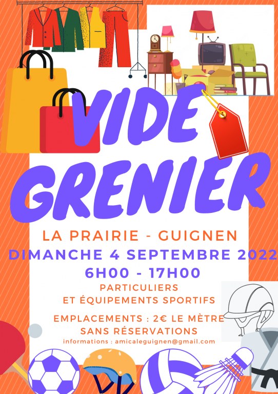 Sans réservation, à partir de 6h00 pour les exposants, 2€ le mètre linéaire, jusqu'à 17h00, pour particuliers, vide grenier et vente d'équipements sportifs en parallèle du forum des associations, espace enherbé de la prairie rue Basse devant les salles de la prairie, forum des associations dans la salle des grands chênes, buvette/restauration sur place