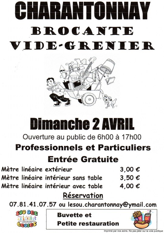 Le sou des écoles de CHARANTONNAY organise sa brocante annuelle le 2 Avril 2017 à la salle des fêtes.
