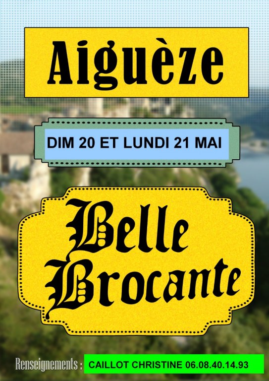 Venez chiner à la brocante d Aiguèze qui aura lieu le 20 et 21 mai, une trentaine d exposant professionnels seront présent pour vous faire découvrir leurs produits et partager leur passion. Vous pourrez aussi découvrir l un des plus beau village de France perché sur une Falaise et surplombant l Ardèche.