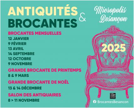 49ème édition du Salon des Antiquaires Du vendredi 6 au lundi 9 novembre 2026 de nombreux antiquaires présenteront des marchandises originales et déco, à Micropolis Parc des Expositions et des Congrès de Besançon. Tout pour mixer les styles et les tendances, entre l'ancien et le contemporain ...