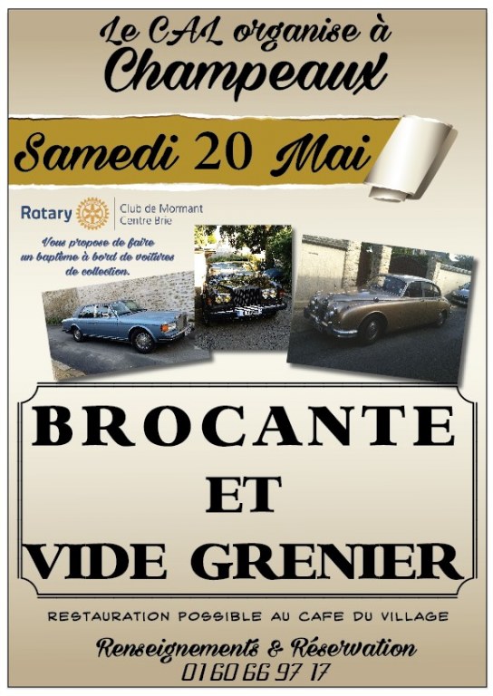 Le CAL organise, le samedi 20 mai 2017, une brocante à CHAMPEAUX (77), à 12 km au nord-est de MELUN.