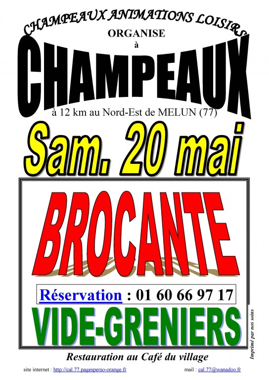 Le CAL organise, le samedi 20 mai 2017, une brocante à CHAMPEAUX (77), à 12 km au nord-est de MELUN.