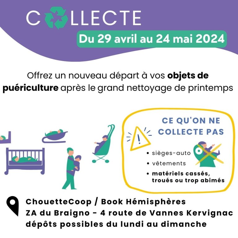 ChouetteCoop Petite enfance (ex Tikoantik), spécialiste du réemploi d'articles de puériculture d'occasion, collecte jusqu'au vendredi 24 mai prochain du matériel de puériculture en bon voire très bon état, dans trois points de collecte du pays de Lorient.