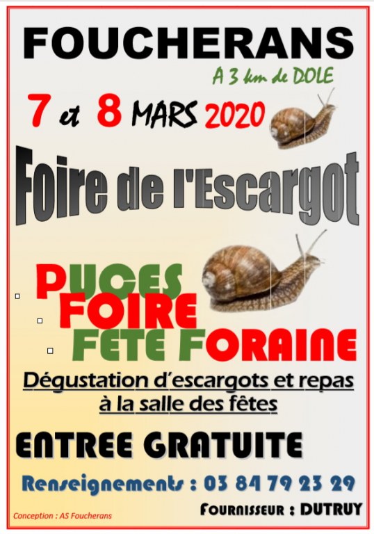 31 foire de l'Escargot associée à des puces. Avec une fête foraine, des dégustations d'escargots à toute heure et repas à la salle des fêtes le samedi et dimanche midi. ENTREE GRATUITE pour les visiteurs. Inscription pour les exposants : 2 euros du ml pour 1 jour et 3 euros pour les 2 jours avec un mini de 5 ml. Métiers de bouche : tarif spécifique et nombre limité. 120 à 140 exposants attendus si la METEO est FAVORABLE