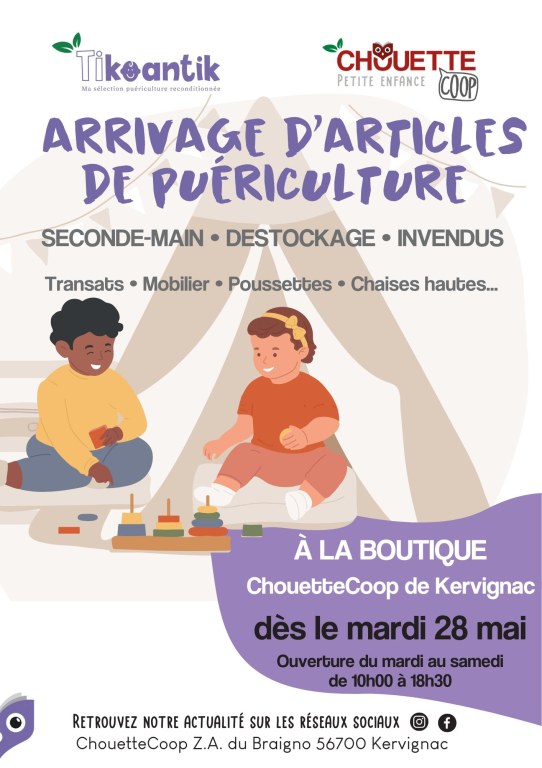 ChouetteCoop Petite Enfance (ex Tikoantik), spécialiste du réemploi d'articles petite enfance d'occasion, vous donne rendez-vous à partir de mardi 28 mai, pour une vente solidaire d'articles de puériculture d'occasion, à petits prix.