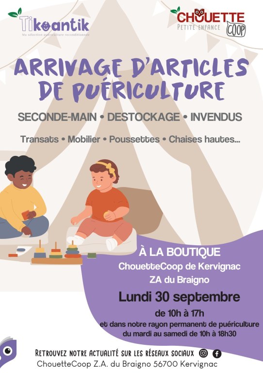 ChouetteCoop Petite enfance, spécialisé dans les articles de puériculture reconditionnés, vous donne rendez-vous à partir du lundi 30 septembre pour une vente solidaire d'articles de puériculture d'occasion, à petits prix.