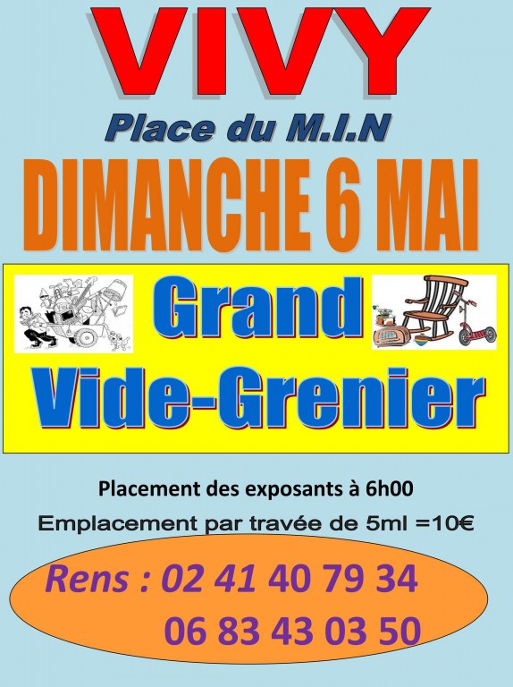 Vivy Grand vide grenier place du Marché gare à partir de 5h30 emplacements par travées de 5ml ou plus soit 10€ l'emplacement Restauration sur place l'alimentaire est excusivement réservé au comité des fêtes