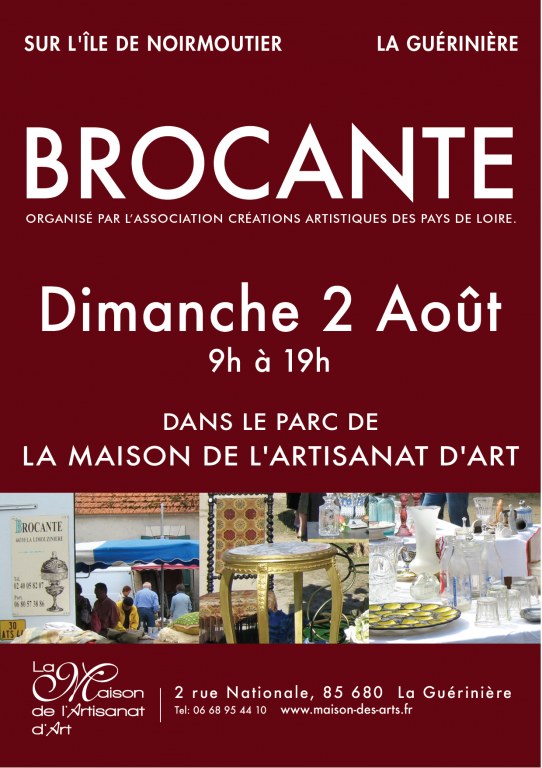 A La Guérinière sur l'Ile de Noirmoutier, brocante professionnelle, dans le parc de la Maison de l'Artisanat d'Art. Venez regarder, fouiller, chiner. et peut être dénicher l'objet convoité. En plus, l'exposition permanente vous fera découvrir les œuvres originales de 50 professionnels des métiers d'art.