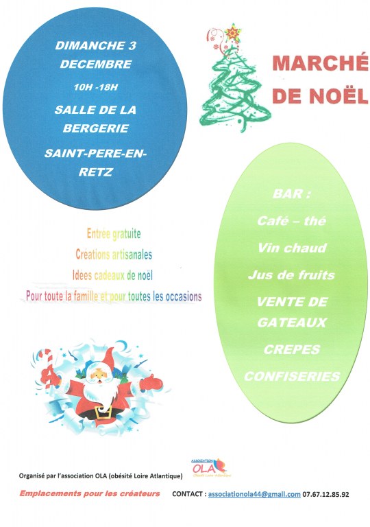 OLA (obésité Loire Atlantique) organise un marché de noël le dimanche 3 décembre de 10h à 18h , salle de la Bergerie à ST Père en Retz.