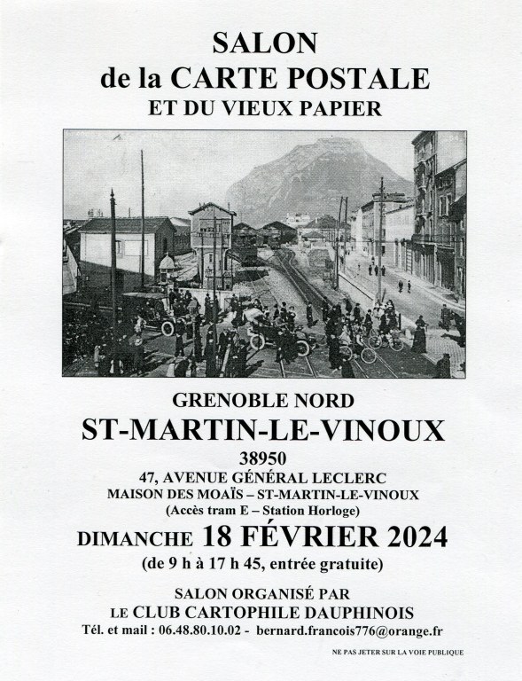 Salon annuel de la carte postale ancienne et du vieux papier organisé par le Club Cartophile Dauphinois à St MARTIN LE VINOUX 38950, Maison des Moaïs, 47 avenue Gal Leclerc. Dans salle chauffée de plain-pied (accès handicapés). Parking à l'arrière. 12 stands de professionnels. Entrée gratuite tout public de 9 h à 18 h. Accès par tram (ligne E) depuis GRENOBLE. Descente station Horloge, St MARTIN LE VINOIUX.