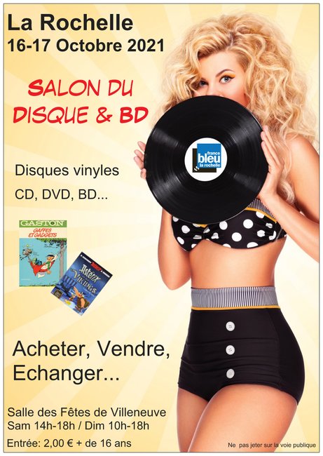 12ème Salon du Disque et BD de La Rochelle, Salle des Fêtes de Villeneuve les Salines pour Acheter, Vendre, Echanger: Disques vinyles, CD, DVD "Neufs-Occasions-Collectors" BD anciennes et nouvelles avec en dédicace la présence d'Auteurs. Photos et Affiches, Livres de collection, Hifi, Produits d'entretien et de protection pour Disquaires et Collectionneurs. Exposants de plusieurs Régions de France et de Belgique. Horaires: Samedi 16 de 14h à 18h et dimanche 17 de 10h à 18h. Restauration chaude sur place. Parking gratuit. Entrée: 2,00 € aux plus de 16 ans.