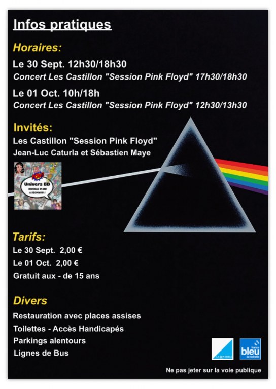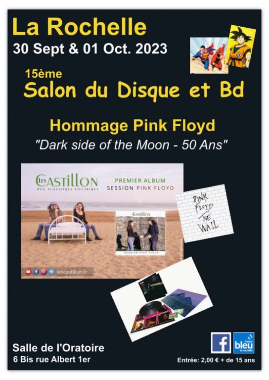 Salon du Disque et BD, Salle de l'Oratoire de La Rochelle le 30/09 et 01/10/2023. Pour cette 15ème Edition: Hommage au groupe Pink Floyd par le groupe Les Castillon. Salon pour Acheter, Vendre et Echanger, Disques vinyles, CD, DVD et BD récentes et anciennes. Produits pour Disquaires et Collectionneurs. Restauration avec places assises. Entrée: 2,00 Euros aux plus de 15 ans. Parkings alentours. Lignes de Bus.