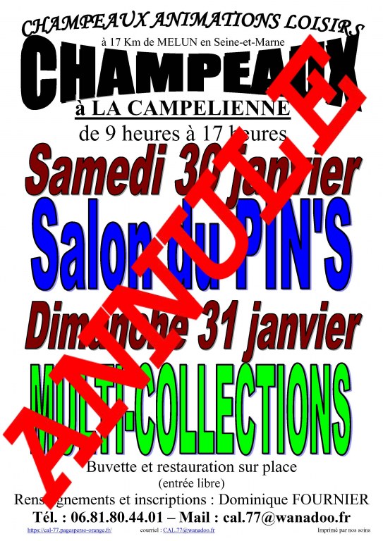 Champeaux Animations Loisirs organise, le samedi 30 janvier 2021, le 17ème salon du pin's à CHAMPEAUX (77). Cette manifestation, seule exposition d'Ile-de-France et l'un des 3 derniers salons nationaux, se déroulera à la salle des fêtes (la Campélienne), toute la journée.