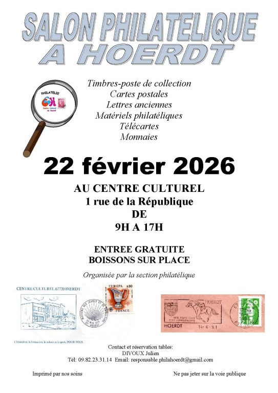 Cette page concerne les brocantes et vide greniers de Salon Philatélique de Hoerdt Rechercher dans la catégorie : Bourse philatélique Rechercher dans la catégorie : philatelique, hoerdt, salon |
