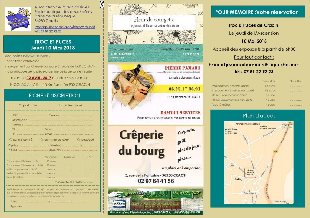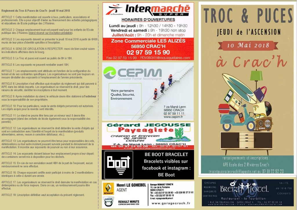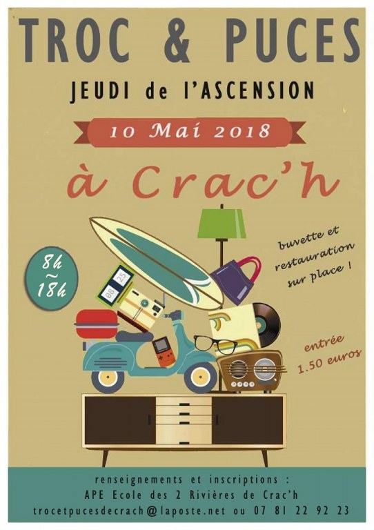 • Chaque année, l'APE de l'école des 2 rivières de Crac'h organise un troc et puces le jeudi de l'Ascension. Situé dans le bourg, cet espace accueille 100 exposants occasionnels ou professionnels. Le tarif exposant : 15€ les 3 ml abrités ; 12€ non abrités. Café, croissant offert par emplacement.