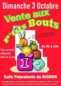 L'association des parents d'élèves des écoles du Bignon organise une « vente aux p'tits bouts », le dimanche matin 3 octobre, de 9h à 13h, à la salle polyvalente du Bignon.