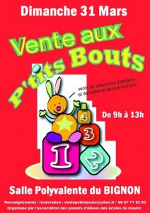 La "vente aux ptits bouts" du Bignon aura lieu à la salle polyvalente, le dimanche 31 mars, de 9h à 12h.