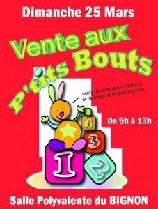 L'association des parents d'élèves de l'école du Bignon organise une "vente aux p'tits bouts" le dimanche 25 mars 2018, de 9h à 13h, à la salle polyvalente du Bignon (44140). Entrée gratuite.