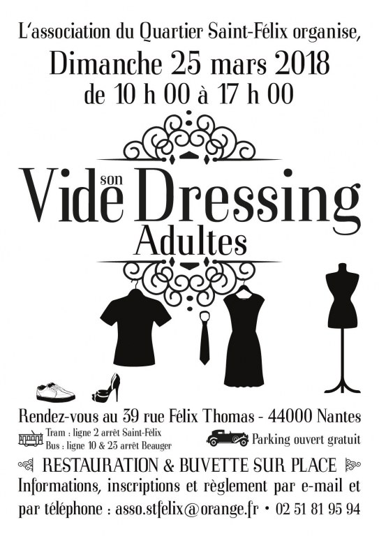 VIDE DRESSING ADULTES le Dimanche 25 mars 2018 - LIEU : 39, rue Félix Thomas à Nantes (Tram 2 : arrêt Saint-Félix - Bus 10 ou 23 : arrêt Beauger) VENTE : le dimanche 25 Mars 2018 de 10h à 17h dans les locaux de l'Association, (mise en place par les vendeurs à partir de 9h). Pour participer, vous devez préalablement vous inscrire auprès de l'Association (asso.stfelix@orange.fr – tél : 02 51 81 95 94) pour réserver un emplacement.