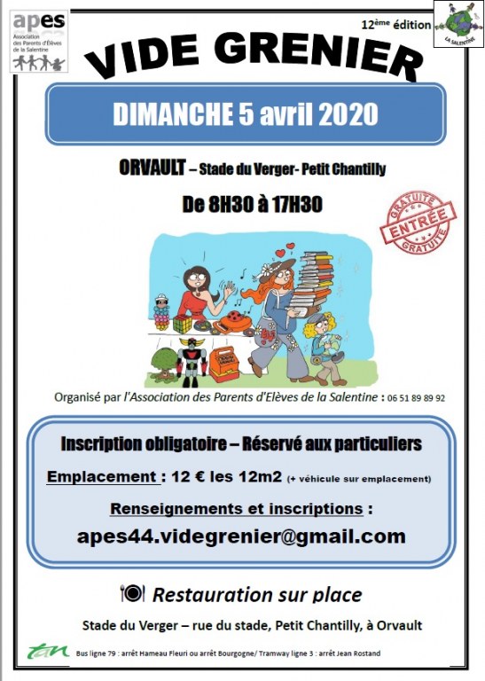 Contact et réservation : apes44.videgrenier@gmail.com ou au 06 51 89 89 92. Merci de préférer le mail, 180 emplacements