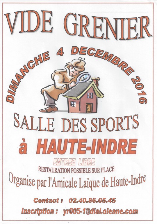Vide grenier du 4 décembre organisé par l'Amicale Laique de Haute Indre se déroulera dans la Salle des Sports - 34 Exposants - entrée visiteurs gratuit - restauration sur place