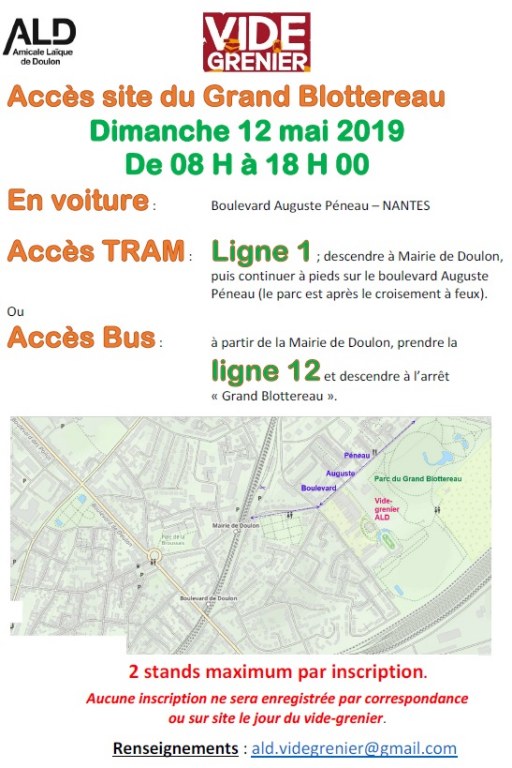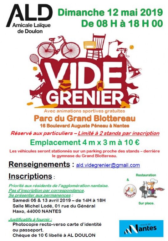 La 6ème édition du vide-grenier annuel de l'Amicale Laïque de Doulon aura lieu le dimanche 12 mai 2019 de 08 H à 18 H 00 dans le parc du Grand Blottereau.