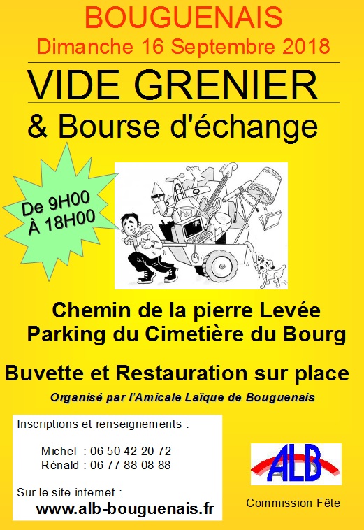 Vide grenier en plein air emplacement 4x3mt pour 10euros acceuil des exposants à partir de 7h pour le public à partir de 9h restauration sur place pour les inscription site de l amicale laique rubrique vide grenier adossier a me envoyer a l adresse indiquée je precise que la bourse d echange est annullée